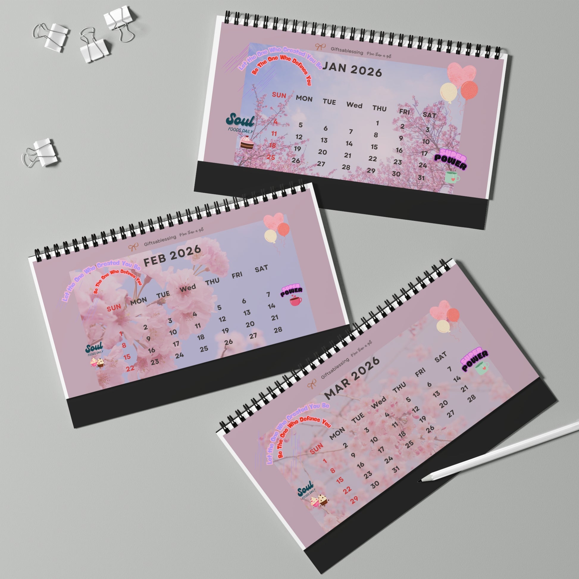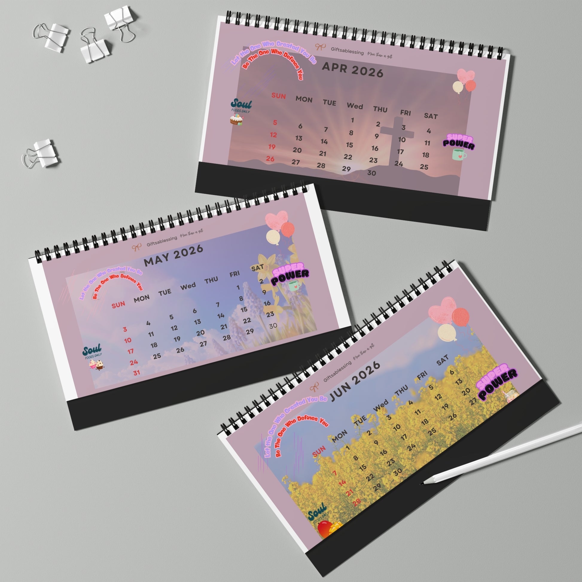 These 2026 desk calendars are made with high quality paper stock (250gsm) that has a satin finish for beautiful decoration that lasts. Each calendar comes in one size of 10" by 5", and comes with black spiral binding as well as a tent backing card. Your artwork is printed in high-fidelity colors and stunning detail.